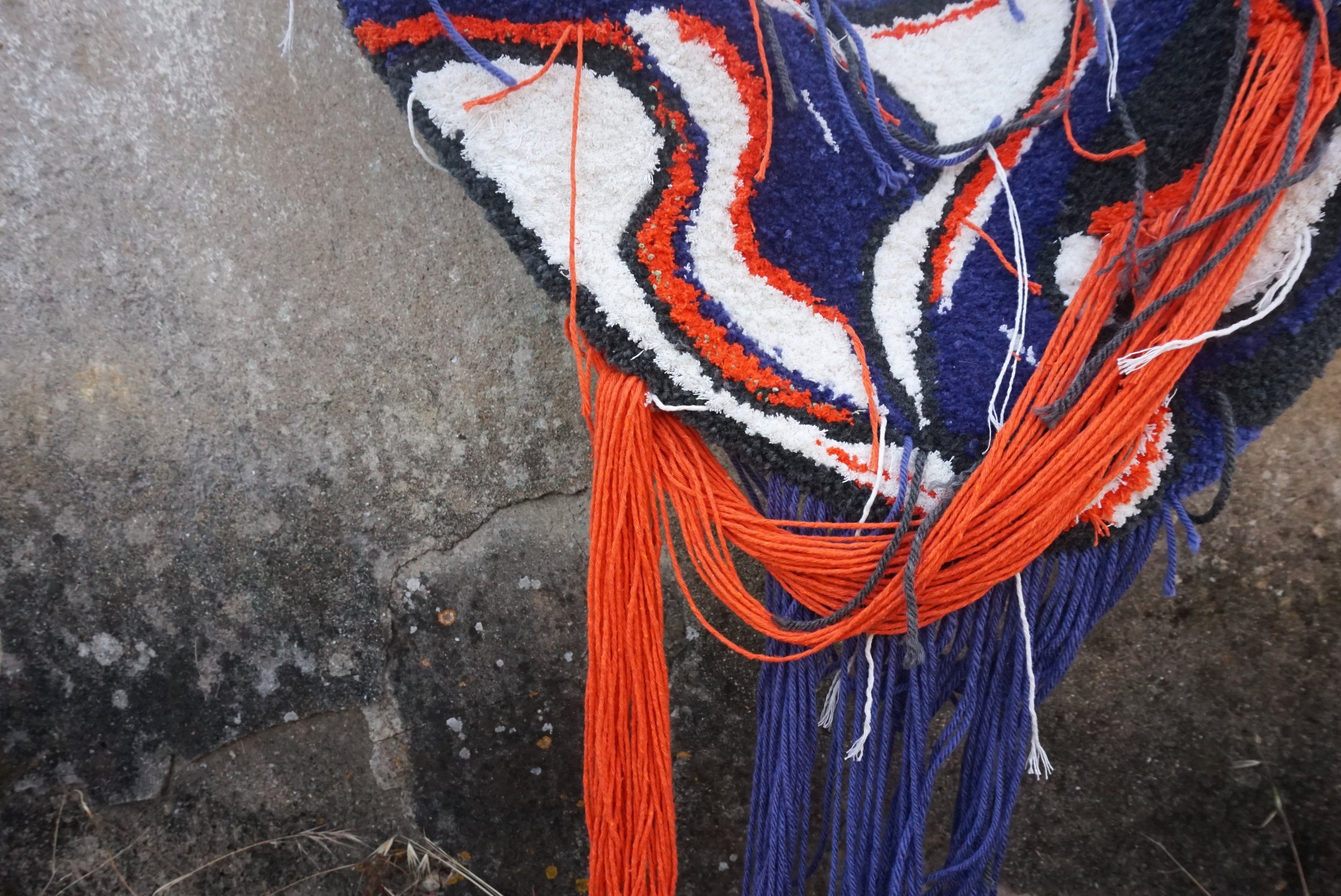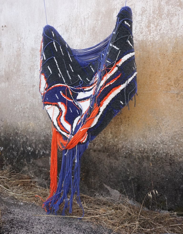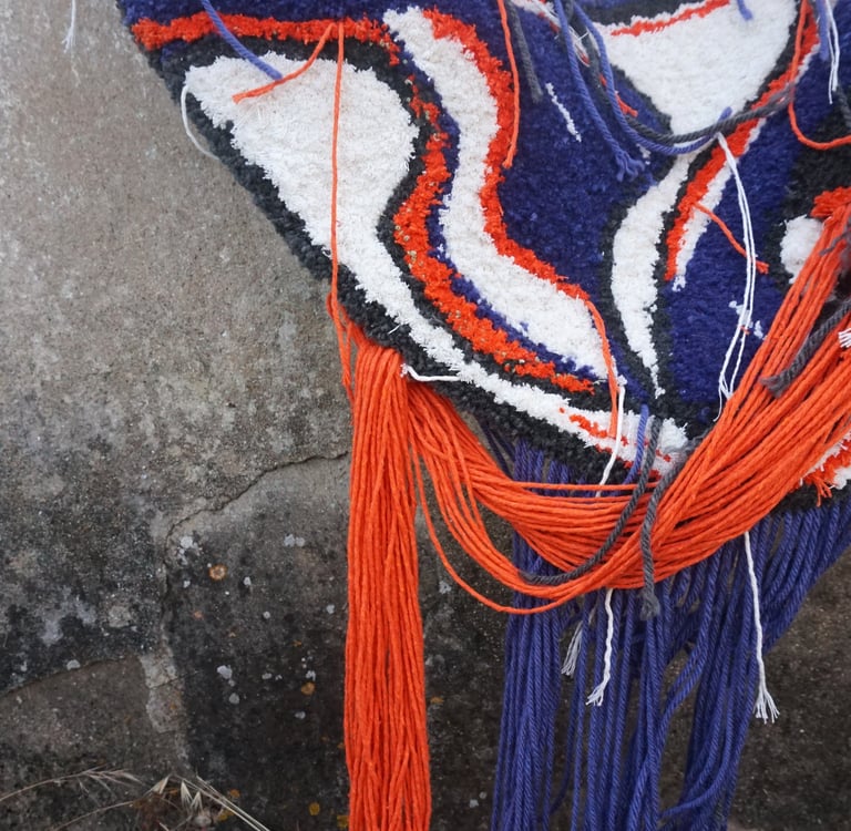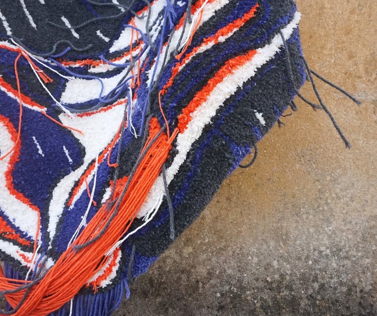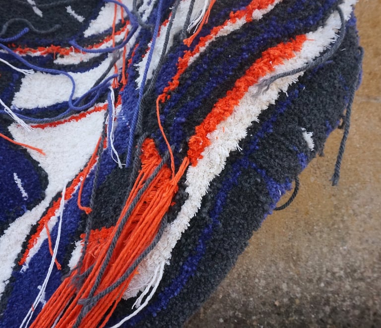 This piece was completed with equal parts intensity and injury: the final stage left me with two band-aids: one from a deep prick by the tufting needle, the other from scissors. Pain, effort, and vulnerability thread through the work, just as they thread through life under pressure.