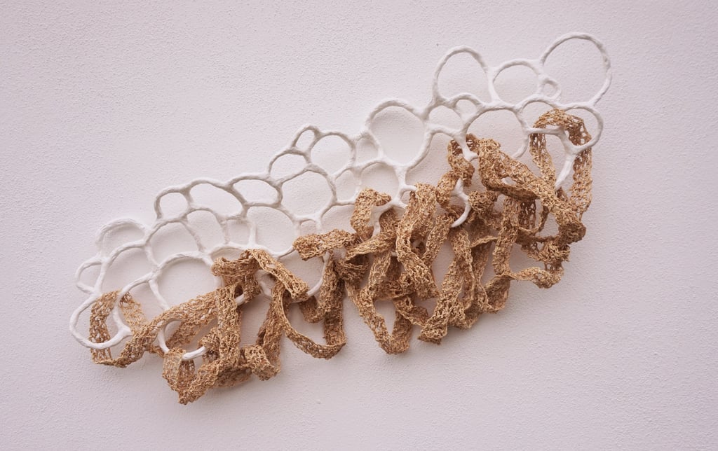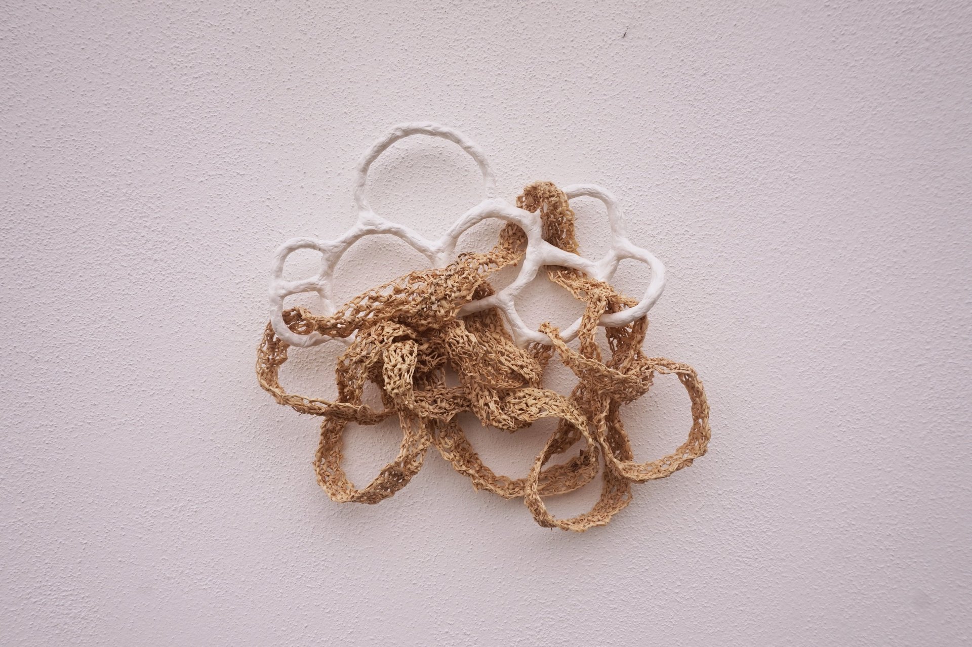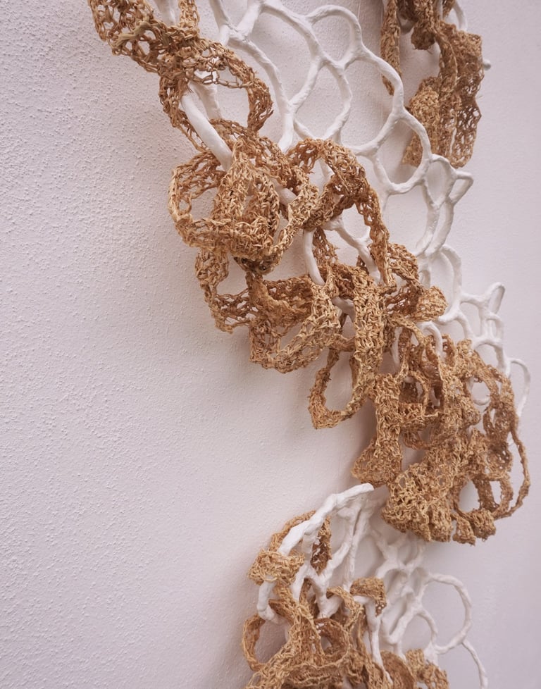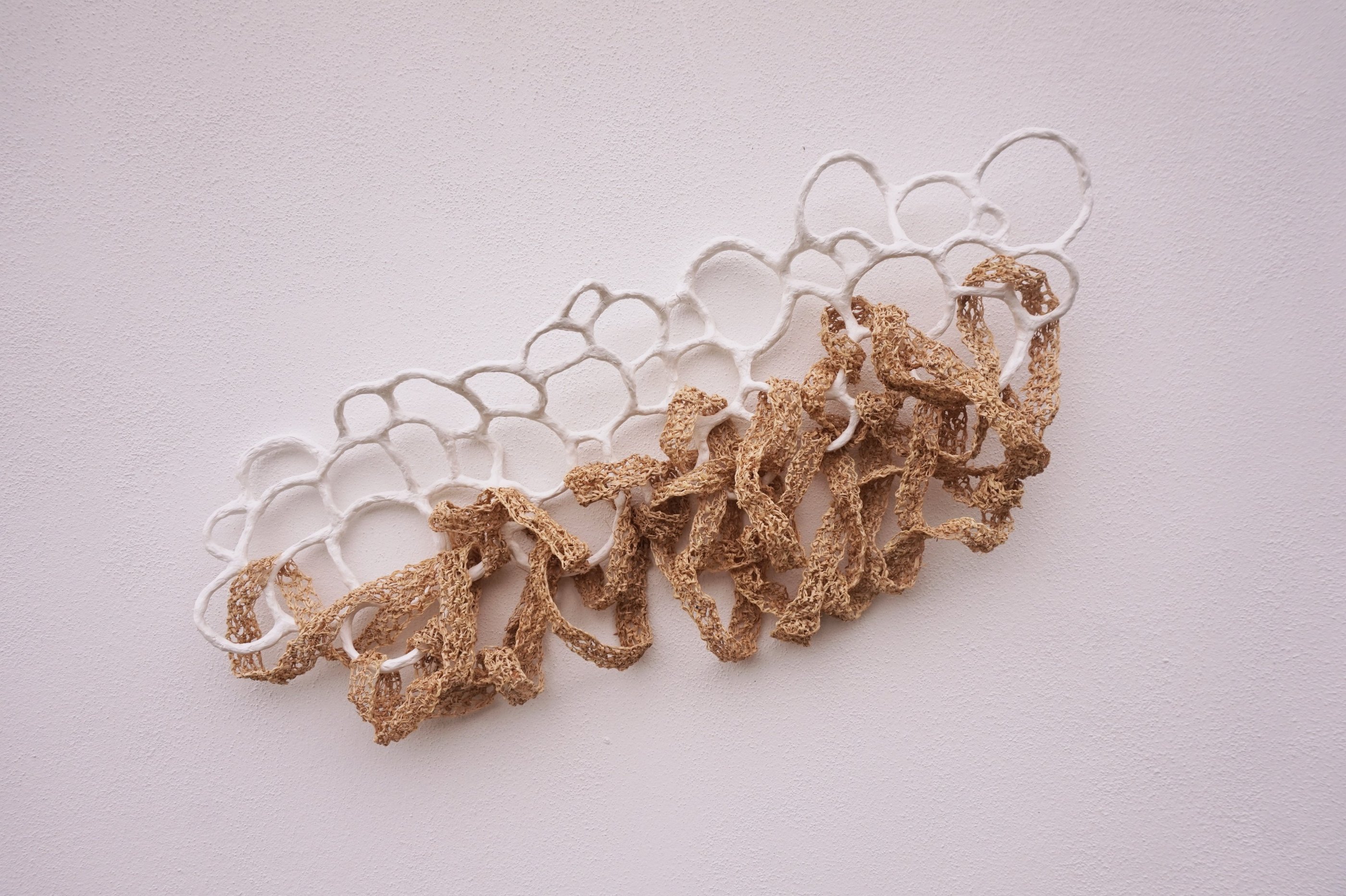 Raffia (dried palm leaves), ceramic; crochet, sculpting.