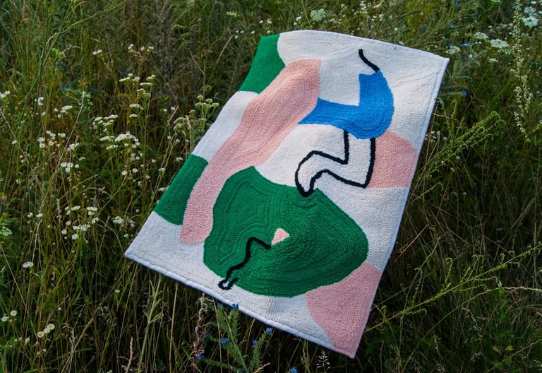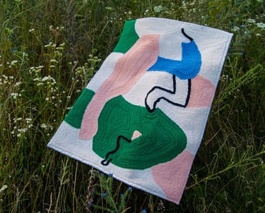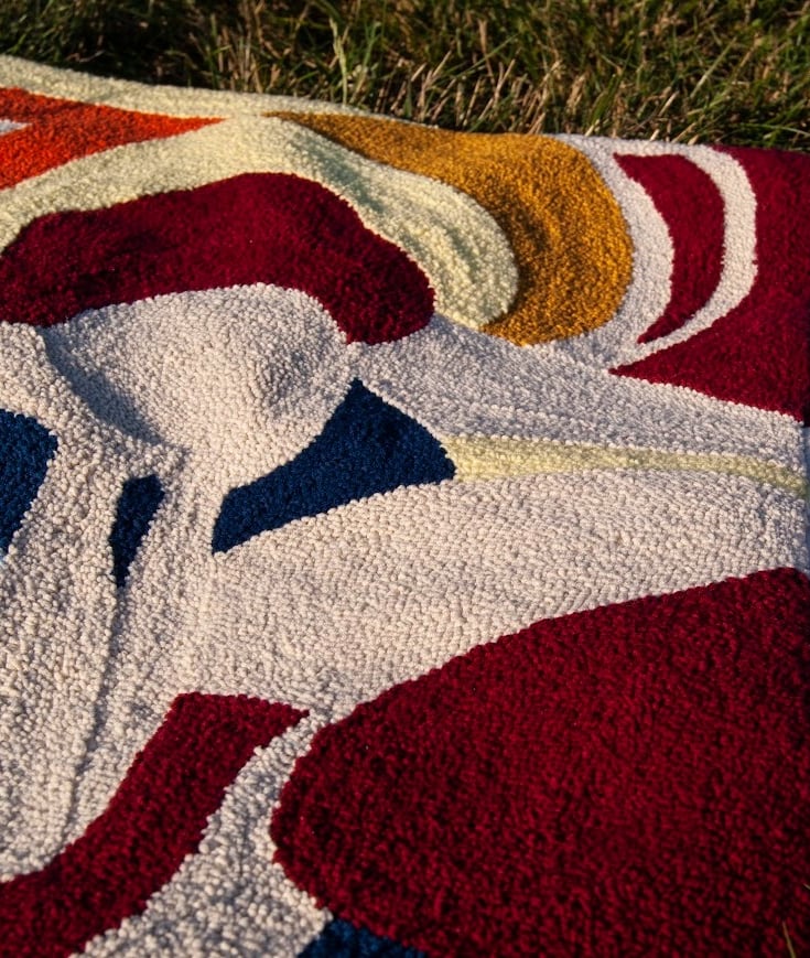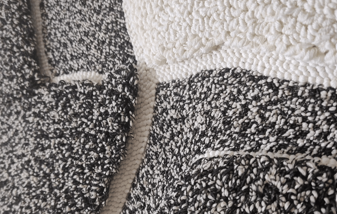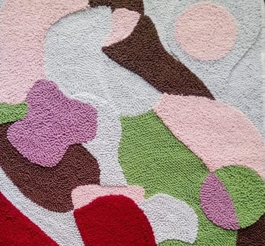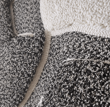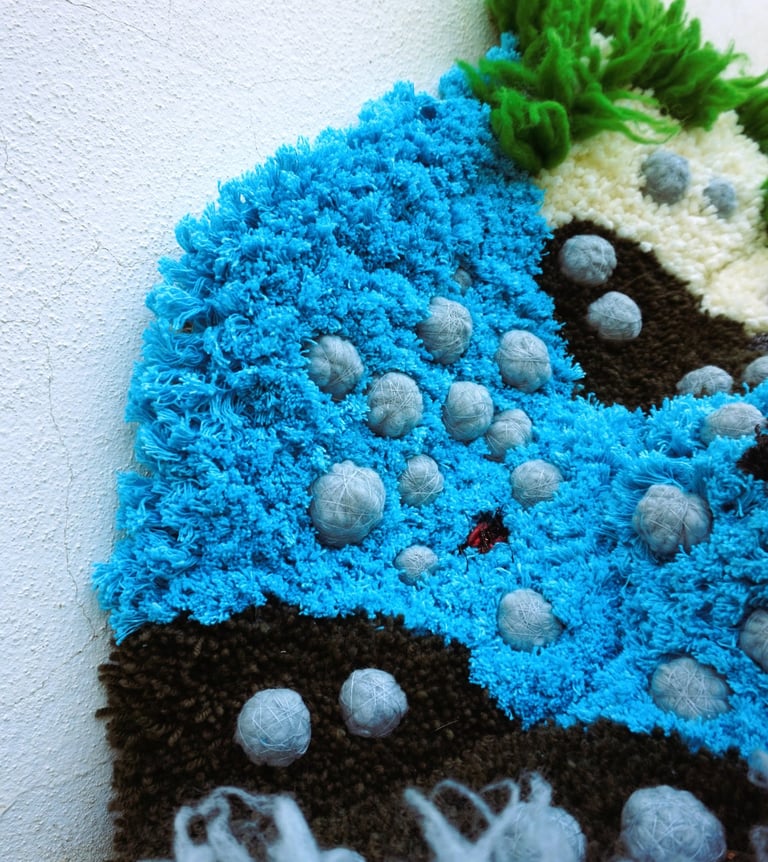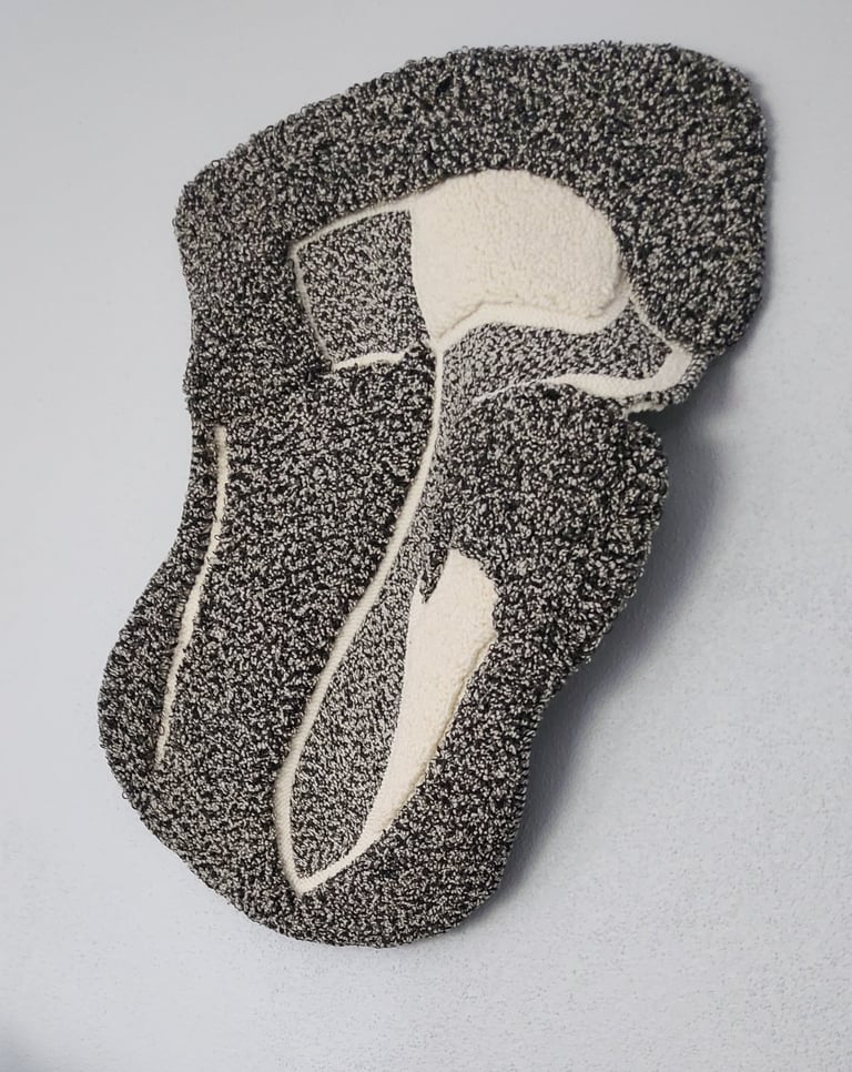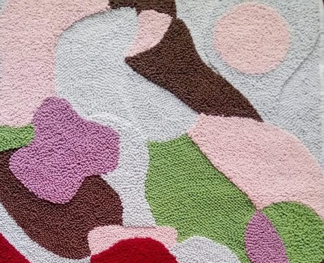 Cotton cords, punch needle; 74*110 сm, 2021. Touch, as one of the important senses, can transform our experiences in space in a very unexpected manner. Sometimes, it seems that with tactile contact, you are either blown apart or deformed in a strange way.
