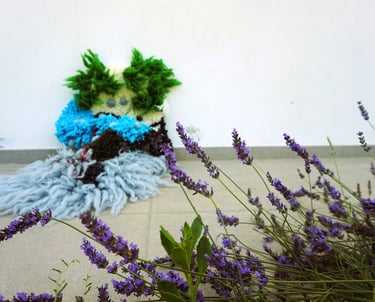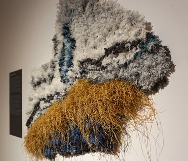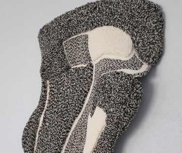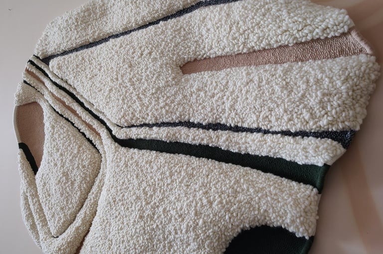 This voluminous wool piece features a dramatic rift, symbolizing life's divides, and delicate woolen bubbles, wrapped with sewing thread, representing separated memories and emotions.